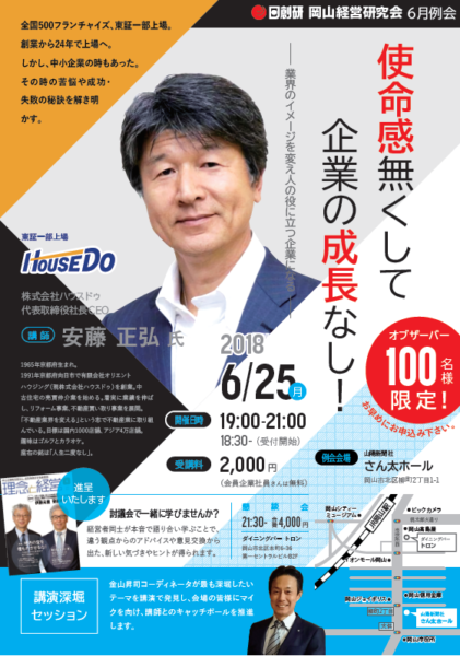 6月例会は東証一部上場企業の安藤社長をお招きして、中小企業だった頃のお話をメインに戦略の組み立てや人材育成、